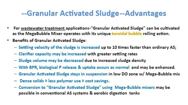 The release of bubbles is based on accumulation of airflow to the mixers. Each mixer has a fixed volume to fill prior to bubble release. The pressure needed is the static pressure at the depth the mixers are mounted and the flowrate of gas to the mixers determines rate of bursts. When enough air or gas fills the Mega Bubble unit, the gas shoots out vertically through a riser tube which pulls in and ejects settled solids on the tank floor into the rising liquid stream drafted behind the large bubble.